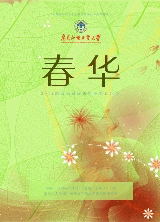 廣東外語外貿大學藝術學院“春華”--2012級優秀畢業生音樂會將于2016年5月9日晚19:30分在廣州大學城廣外藝術學院小劇場舉行,誠邀全校師生光臨指導。