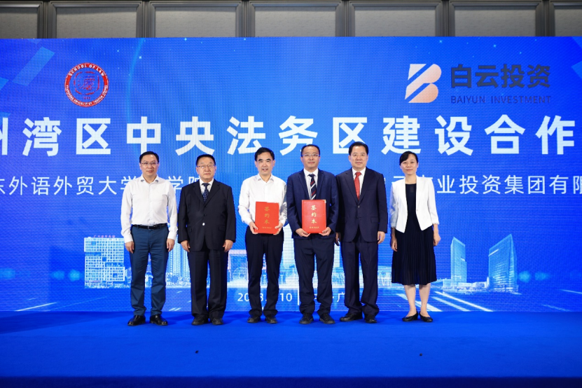 開幕式后,廣東外語外貿大學法學院院長陳云良與廣州白云產業投資集團有限公司董事長孫克君分別代表廣東外語外貿大學法學院與廣州白云產業投資集團有限公司簽訂了《廣州灣區中央法務區建設合作協議》。雙方將攜手打造政產學研用一體協同、深度融合的一流法律服務高地,推動廣州灣區中央法務區白云中心區高質量發展,共同助力白云中心區。