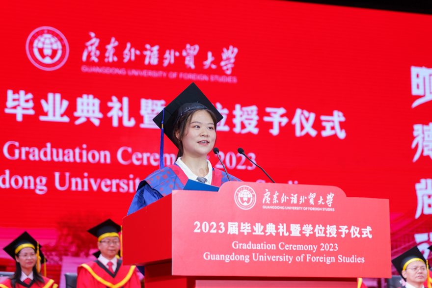 畢業(yè)生代表、國際關系學院本科生陳梓源表達了對母校、父母、師長、同學的感謝。他表示,廣外是一個鼓勵并支持學子不斷前進的地方,也是一個增長學子學識,開闊其視野的地方,更是錘煉學子心性的地方,為廣外學子提供了許多機遇與平臺,定能讓同學們更好地面對未來的生活。