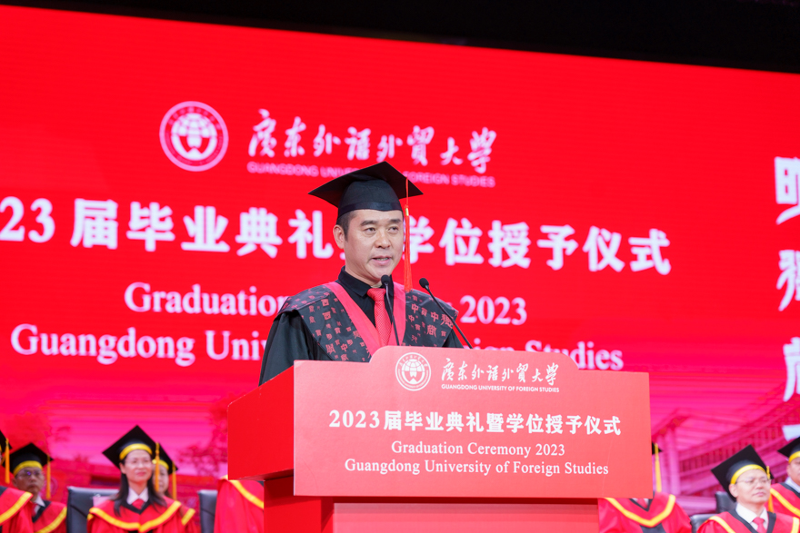 我校1990級日語專業(yè)校友,廣州市委宣傳部副部長、市新聞辦主任朱小燚在發(fā)言中表達了對母校的感激之情,他向畢業(yè)生們分享了工作學習中的心得體會:學識是最好的通行證,語言是最美的連心橋。要保持好學之心,勤奮之行,修煉好內(nèi)功,涵養(yǎng)中華文化根基,更好地讀懂中國、讀懂世界。有德才能服人,有愛方能致遠。希望大家能找準自己的方向,義無反顧地奮力奔跑,滿懷愛意地對待自己的工作、生活。講好新時代的故事,書寫人生華章。作為青年學子,當傾其所學,盡其所能,為時代、為祖國、為人類奉獻力量。