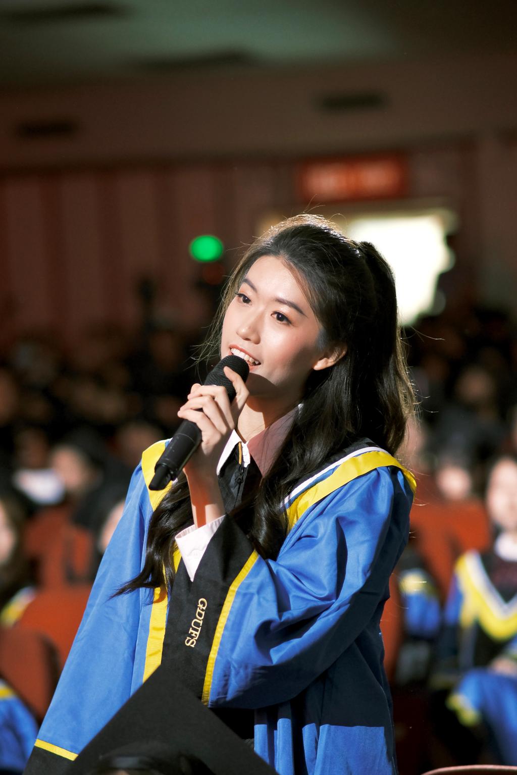 畢業(yè)生代表、西方語言文化學院碩士研究生楊俊嫻回憶起與廣外的獨家記憶,表示在畢業(yè)之際,最想說的就是一句真摯的“感恩母校”。她表示,感恩母校的悉心培養(yǎng),讓同學們得以在各行各業(yè)綻放自己的光彩;感恩母校的真切關懷,帶給了同學們十足的安全感和數(shù)不清的感動;感恩母校的美好氛圍,讓同學們真切感悟到“學貫中西”的內(nèi)涵。