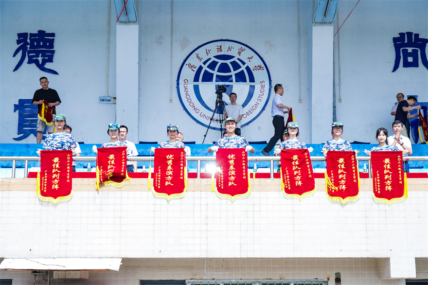 李云明、唐銳分別作總結(jié)講話并向番禺區(qū)人民武裝部贈送錦旗。李云明表示,本次軍訓(xùn)匯演場面壯觀、氣勢磅礴,洋溢著青春與活力,凝聚著辛勞與汗水,充分展示了廣外學(xué)子的精神風(fēng)貌。在短短14天的時間里,同學(xué)們傳承了廣外人敢于拼搏的精神和勇氣,展現(xiàn)了青年人不怕苦、不怕累的品質(zhì)與作風(fēng),詮釋了當(dāng)代大學(xué)生立志成才的使命與擔(dān)當(dāng),這段經(jīng)歷必將成為同學(xué)們終身難忘的美好回憶。唐銳表示,經(jīng)過14天的磨礪,同學(xué)們鍛造了堅強(qiáng)的意志,培養(yǎng)了雷厲風(fēng)行、令行禁止的作風(fēng),激發(fā)了愛國主義熱情和集體主義精神。希望同學(xué)們珍惜軍訓(xùn)成果,在今后的學(xué)習(xí)和生活中,繼續(xù)發(fā)揚(yáng)軍訓(xùn)的好作風(fēng)、好傳統(tǒng),勇毅前行、奮發(fā)有為,共建卓越廣外,共創(chuàng)美好未來。