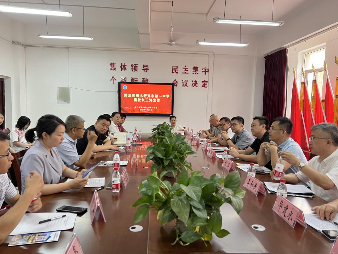 唐銳一行會見了第三師圖木舒克市委副書記、副師長曲洪淇。曲洪淇對我校西部計劃志愿者的辛勤付出表示肯定,并歡迎更多優秀的廣外師生,到西部地區扎根落地,助力南疆發展。第三師圖木舒克市副師長查永杰、廣東援疆駐第三師圖木舒克市工作隊副隊長葉松根、第三師圖木舒克市團委書記魏皓陽、副書記劉斐斐,校團委書記劉郎、商學院黨委書記肖喜明、翻譯學院黨委書記李和民、公管學院黨委書記邵兵、人力資源部副部長吳志軍、校團委副書記趙繼偉等一同參加調研。