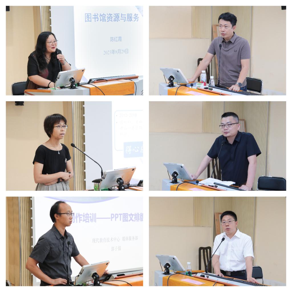 圖書館黨委書記陳紅霞從數字資源、圖書館借閱服務、論文查重服務等方面介紹了圖書館的多元化功能。英語教育學院副院長劉亮星介紹了混合式教學模式的側重點與優勢,強調教學中“兩性一度”與形成性評價的重要意義。外國語言學及應用語言學研究中心教授張藝瓊以自身經驗為例,深入探討論文撰寫與項目申請的關鍵要素,詳盡闡述了基于設計思維的科研項目申報方法。廣東國際戰略研究院教授韓永輝從研究設計與成果發表的角度出發,勉勵新入職教師堅守學術底線,做高水平、標志性學術研究。現代教育技術中心媒體服務部主任郭子儒圍繞圖片、配色、字體、資源等方面,分享了課件制作的圖文排版技巧。教師發展中心副主任董俊武則從背景與現狀、體系構建、重點舉措等方面深入講解了廣外教師發展體系、培訓資源與服務平臺。