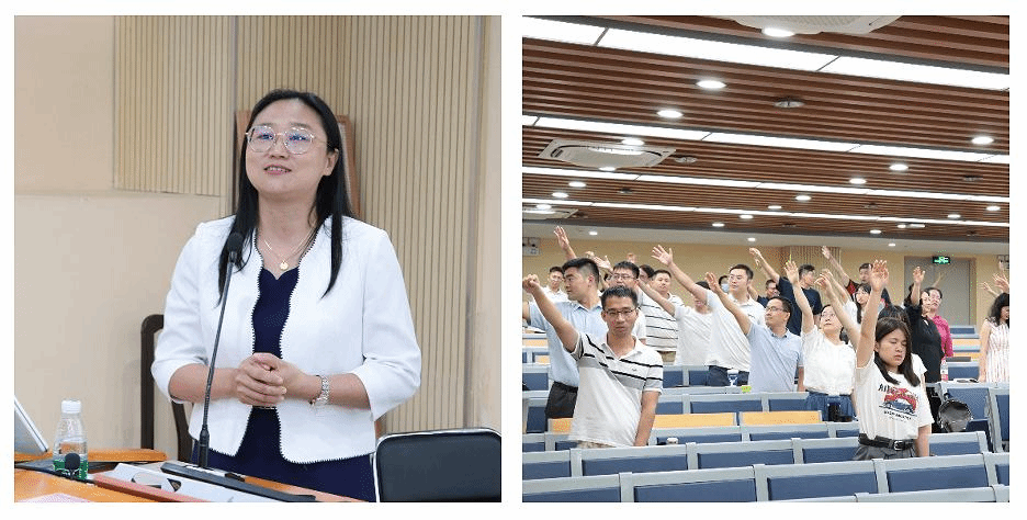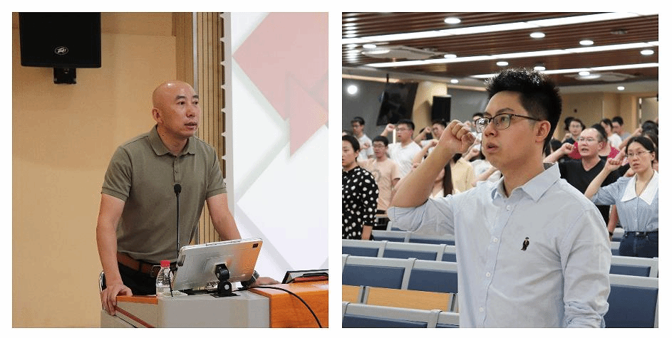 在師德師風、法治教育模塊,組織了全體新進教師舉行教師宣誓儀式,我校原校長黃建華教授作了題為“賡續廣外精神 傳承學術之魂”的報告。黃建華以風趣幽默的語言,漫談教書育人點滴,傳承廣外人的教育情懷與奮斗精神。英語語言文化學院教授歐陽護華則以自身從教生涯為例,闡釋了如何科學規劃職業生涯,并著重強調了嚴謹治學及保持高尚師德的深遠影響。黨委辦公室(校長辦公室)副主任、法治辦公室主任王淑君從案例分析談法治思維,強調了依法依規處事的重要性。教師工作部、人力資源部副部長吳志軍解讀新時代師德規范,為新廣外人筑牢信念感、責任感、使命感。