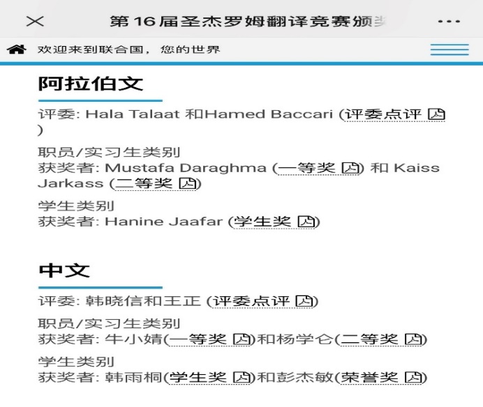 第16屆聯(lián)合國圣杰羅姆翻譯競賽獲獎名單截圖