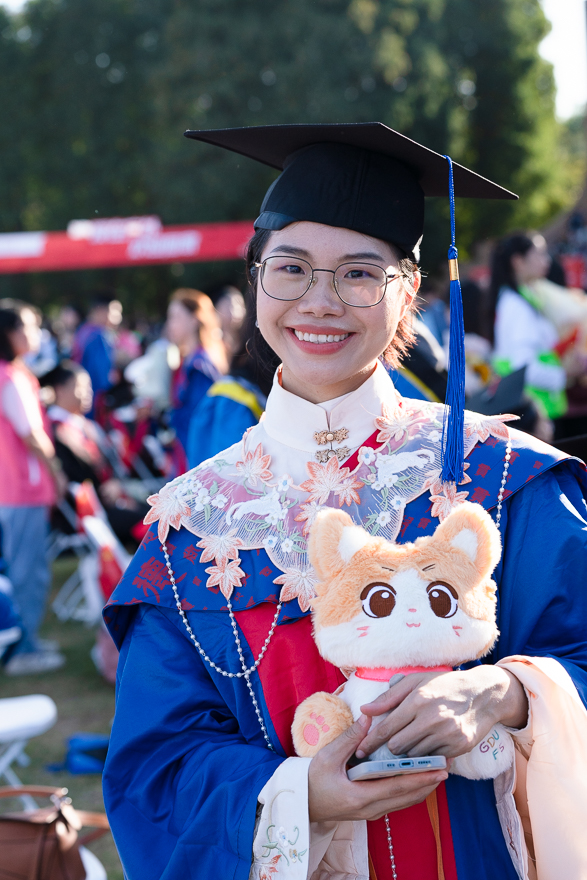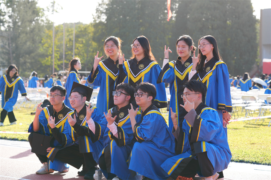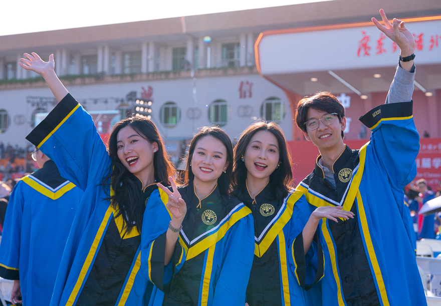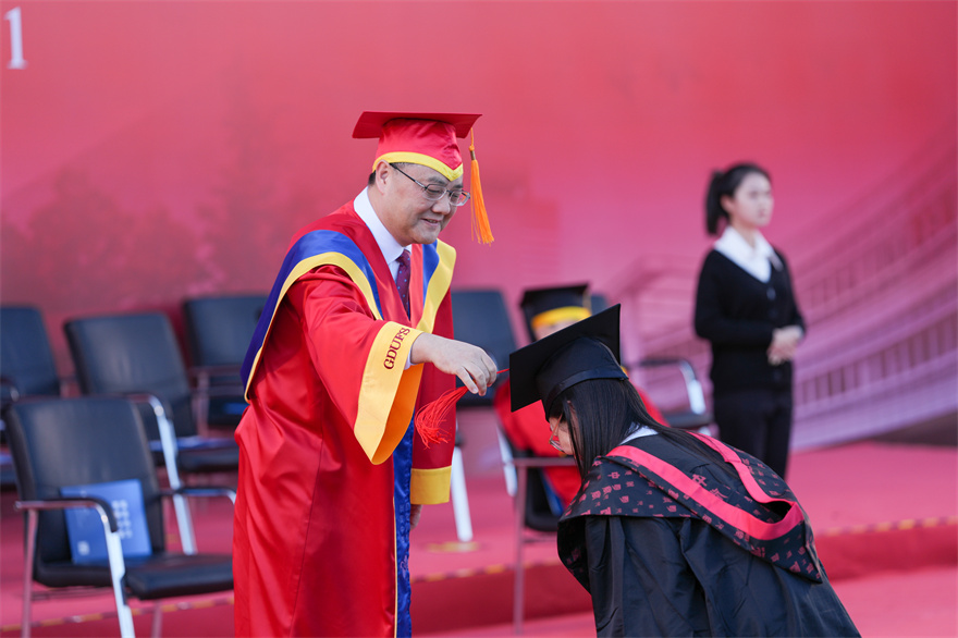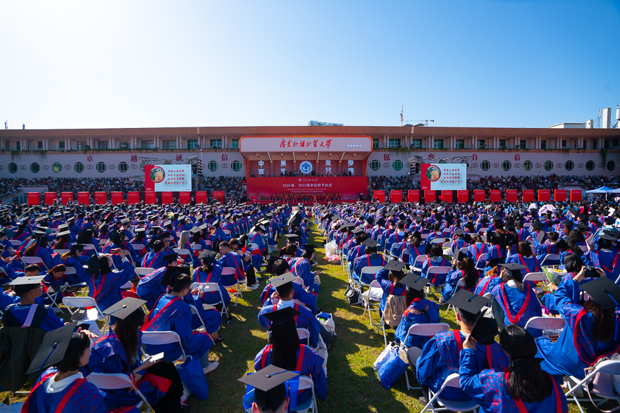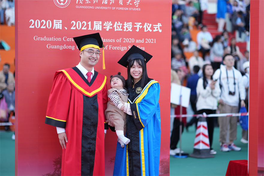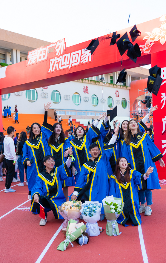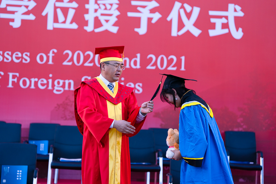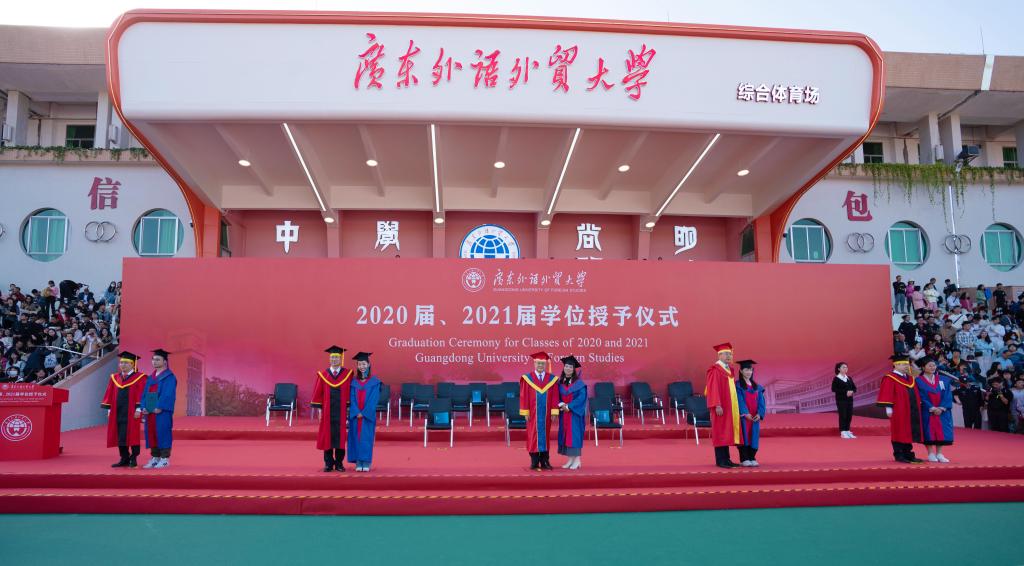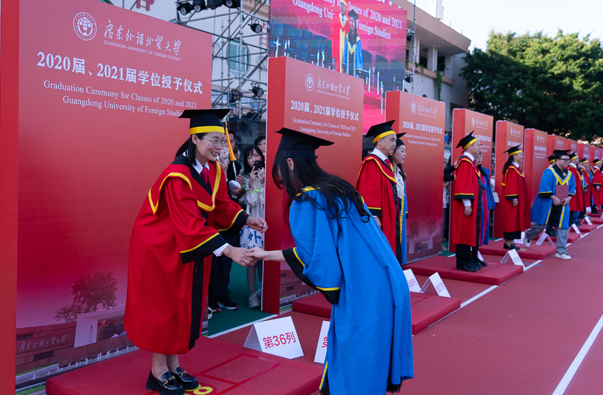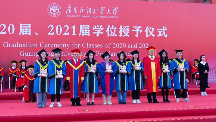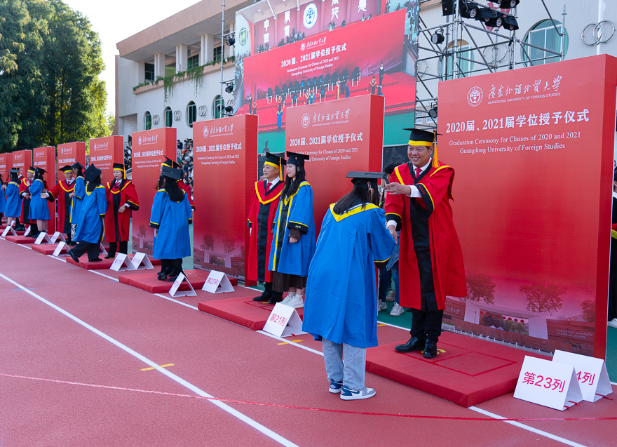 在全體畢業生宣誓后,校領導、主禮教授為每一位返校的2020屆、2021屆校友撥穗授禮,合影留念,為同學們在廣外的青春歲月畫上圓滿的句號。