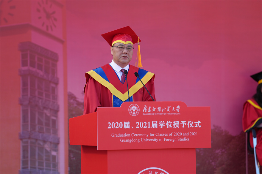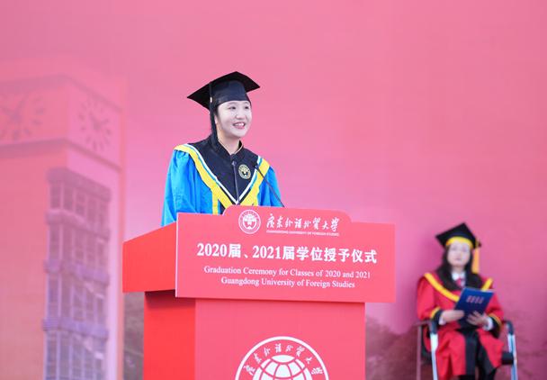 校友代表、新聞學院2020屆畢業生王明哲在發言中感謝母校用一場盛大的告別儀式,為同學們人生中極具紀念意義的大學生活畫上一個圓滿的句號。他表示,在廣外的求學時光有遇見、有嘗試、有突破、更有收獲,今后將始終秉持“卓越、誠信、包容、自信”的廣外價值觀,不斷成長為更好的自己。