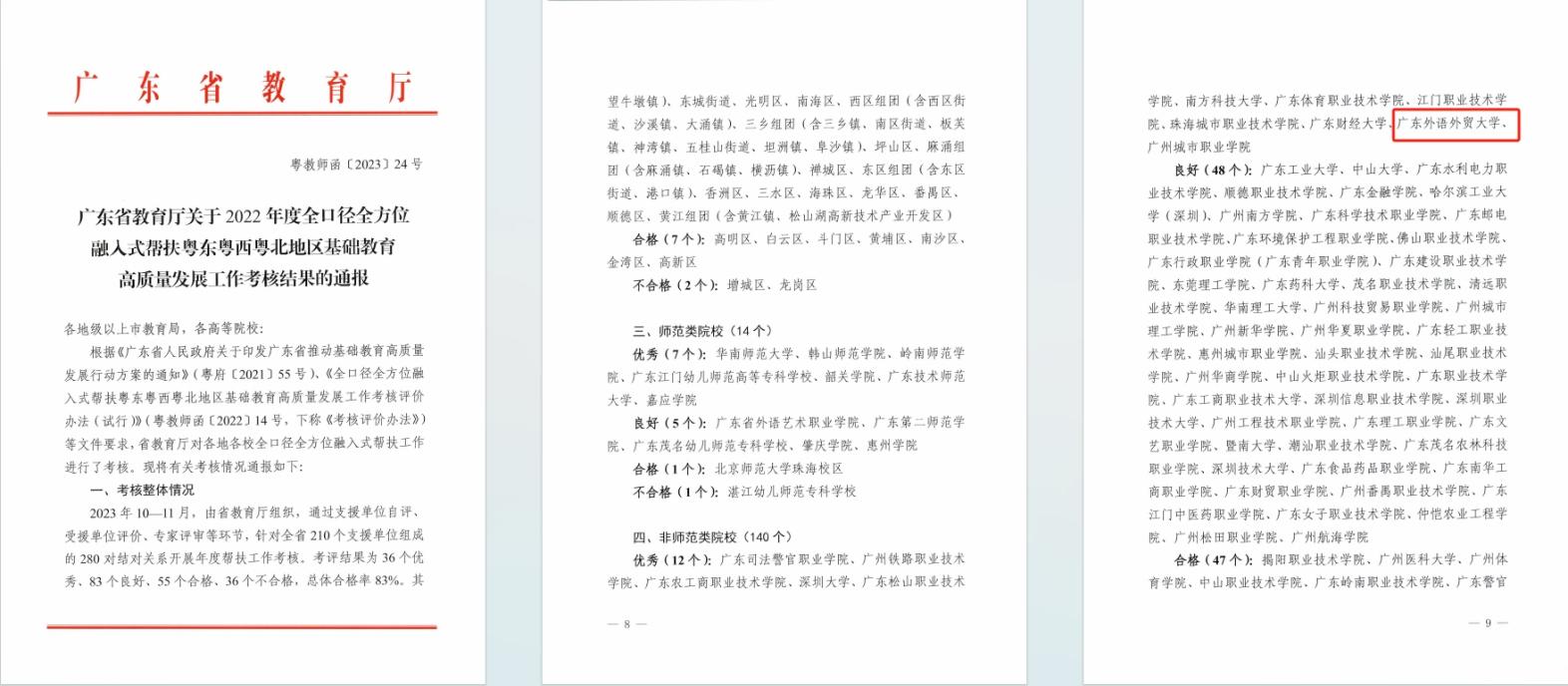 本網(wǎng)訊 近日,廣東省教育廳印發(fā)《廣東省教育廳關(guān)于2022年度全口徑全方位融入式幫扶粵東粵西粵北地區(qū)基礎教育高質(zhì)量發(fā)展工作考核結(jié)果的通報》(粵教師函〔2023〕24號),我校被評為“優(yōu)秀”等級。