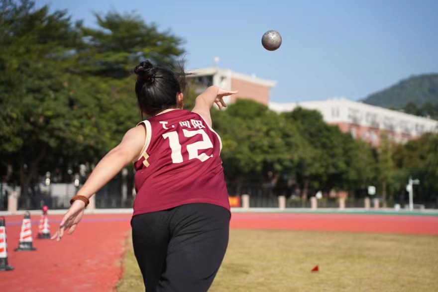 當(dāng)被問到取得佳績的“秘訣”時(shí),吳桐斌說道:“我練習(xí)三級(jí)跳遠(yuǎn)已經(jīng)七年了,這個(gè)熱身姿勢能讓我更好地調(diào)動(dòng)自己整個(gè)身體。”既懷著運(yùn)動(dòng)的興奮與激昂,又不失沉著冷靜,吳桐斌輕輕一躍,便引得全場觀眾歡呼,紛紛舉起手機(jī)抓拍這一精彩瞬間。長期的市隊(duì)訓(xùn)練經(jīng)驗(yàn)助力他在校運(yùn)會(huì)中保持節(jié)奏穩(wěn)定,發(fā)揮出超群的實(shí)力。“比賽前沒有對(duì)成績做出預(yù)想,只想著要跳好一點(diǎn),不辜負(fù)學(xué)長學(xué)姐們的期望。”多年的參賽經(jīng)歷和充足的經(jīng)驗(yàn)讓他能夠從容應(yīng)對(duì)校運(yùn)會(huì),但得知努力換取了勝利、超越了紀(jì)錄時(shí),吳桐斌仍面露欣喜,露出興奮的笑容。