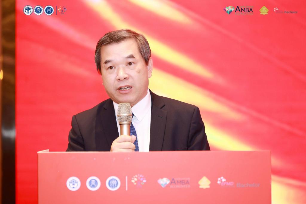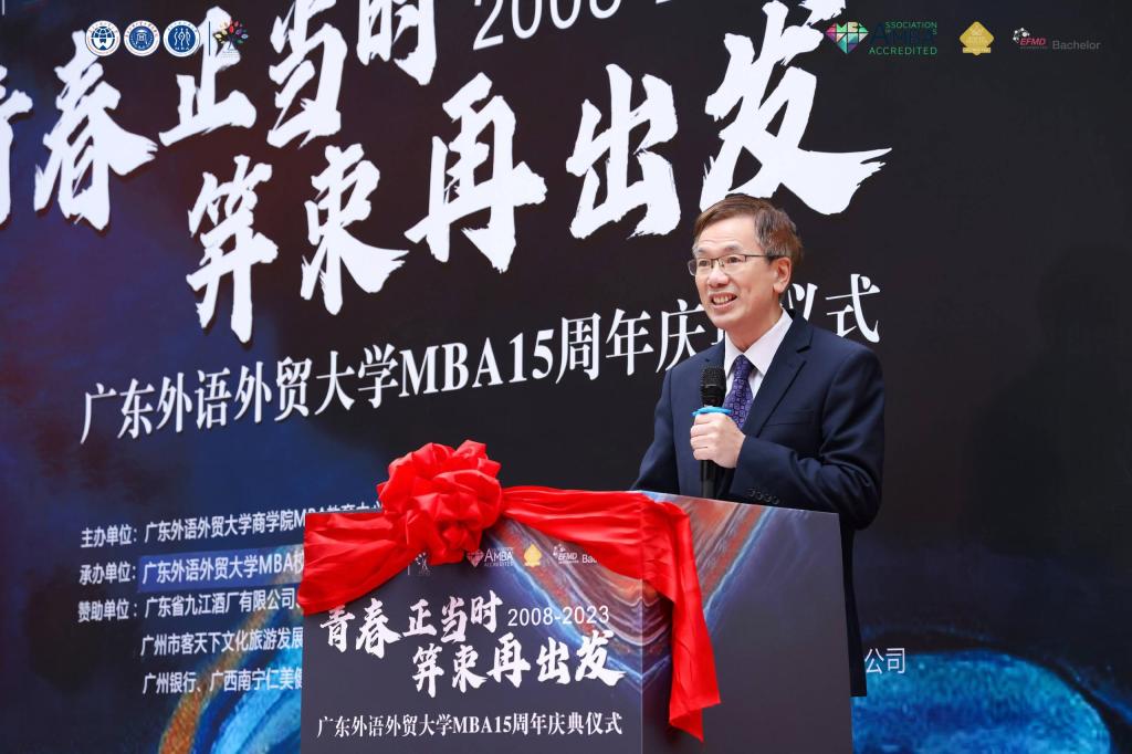 何傳添代表大學致辭。他首先對與會嘉賓、校友表示熱烈的歡迎和衷心的感謝。他強調廣外MBA堅持“全球視野、中國商道”的辦學理念,以“培養融貫中西的國際化高質量管理人才”為使命,開展了形式多樣的國際交流與合作項目,贏得了廣泛贊譽。他期望MBA中心持續打造“國際化”和“數字化”兩大特色,緊跟國際學術前沿,傳播本土商科理念,并全面提升教育和服務水平,為全體MBA學生、校友創造可持續發展平臺,為商學院和學校建設添磚加瓦。