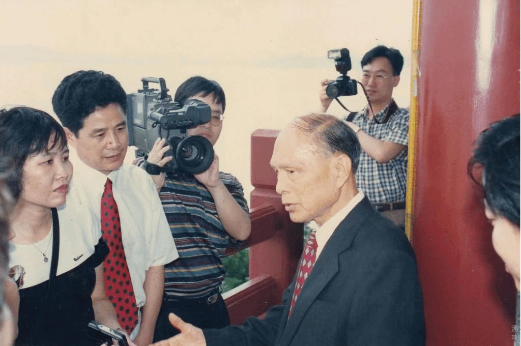 魯大錚(左二)在番禺南沙采訪霍英東先生