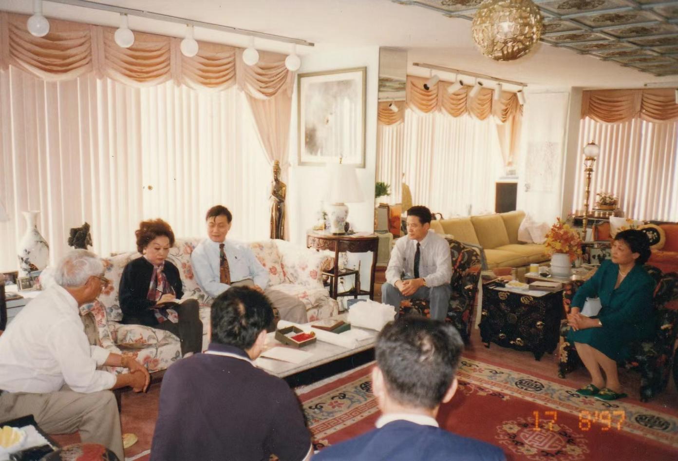 魯大錚(右二)在美國華盛頓水門公寓采訪陳香梅女士