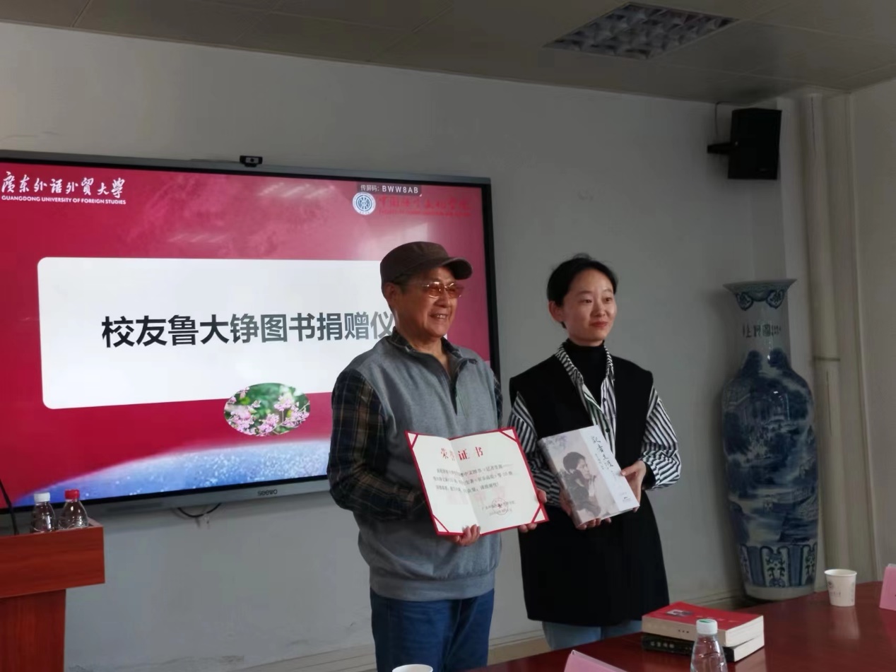 魯大錚校友伉儷向我校圖書館捐贈《記者生涯——魯大錚文集》及李凌先生著作《音樂流花》等一批圖書。孟小玲老師代表我校圖書館接受捐贈并向魯大錚頒授捐贈證書。校友發展處處長肖鋒出席活動。本次講座由中文學院黨委副書記吳俊峰主持。