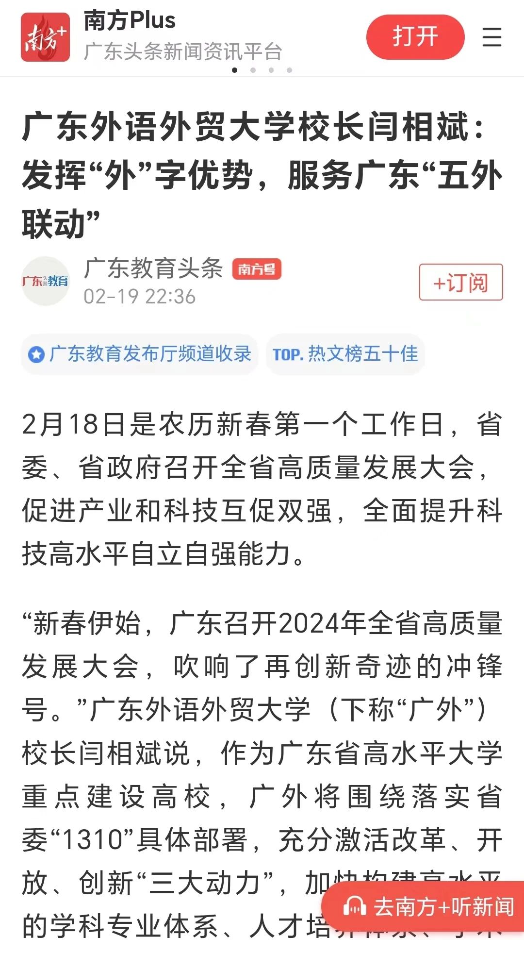 “新春伊始,廣東召開2024年全省高質量發展大會,吹響了再創新奇跡的沖鋒號。”廣東外語外貿大學校長閆相斌說,作為廣東省高水平大學重點建設高校,廣外將圍繞落實省委“1310”具體部署,充分激活改革、開放、創新“三大動力”,加快構建高水平的學科專業體系、人才培養體系、學術話語體系,以自身教育事業的高質量發展為廣東高質量發展大局貢獻廣外力量。