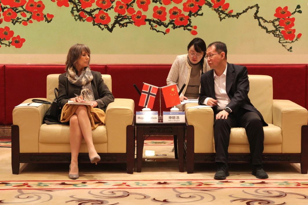 申明浩首先對海歌總領事一行的來訪表示熱烈的歡迎,并詳細介紹了我校在國際化人才培養等方面的卓越成就。他指出,我校作為華南地區國際化人才培養、外國語言文學、全球經濟治理、涉外法治研究及中華文化國際傳播的重要基地,充分利用多語種學科優勢,積極探索、創新人才培養模式,以多語種、多學科交叉專業為特色,培養具備國際視野的復合型人才。申明浩強調,我校與奧斯陸大學等挪威高校在國際化人才培養和學科建設方面有諸多共通之處,期待未來進一步拓展與挪威高校和研究機構的合作,共同搭建兩國高校間友好交流的平臺,為推動中挪人文教育事業的發展貢獻更大的力量。