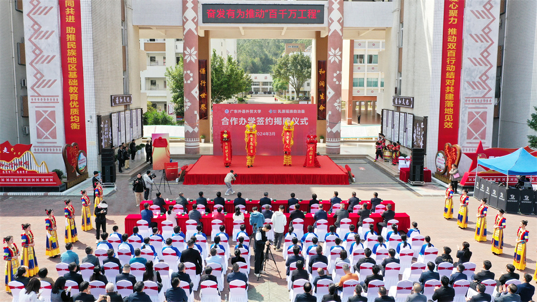 據了解,省實施百校聯百縣助力“百縣千鎮萬村高質量發展工程”行動,推動省內百家高校院所與109個涉農縣(市、區)結對共建。乳源瑤族自治縣和廣外是全省首批的7對校地合作試點單位之一,本次合作辦學托管學校為縣民族實驗學校,該項目是目前“雙百行動”中全省高校第一個簽約的縣中托管項目,雙方將在義務教育托管乃至高中教育托管上深化合作,發揮優質資源的輻射引領作用,促進縣域基礎教育高質量發展,全面增強縣城綜合承載能力。