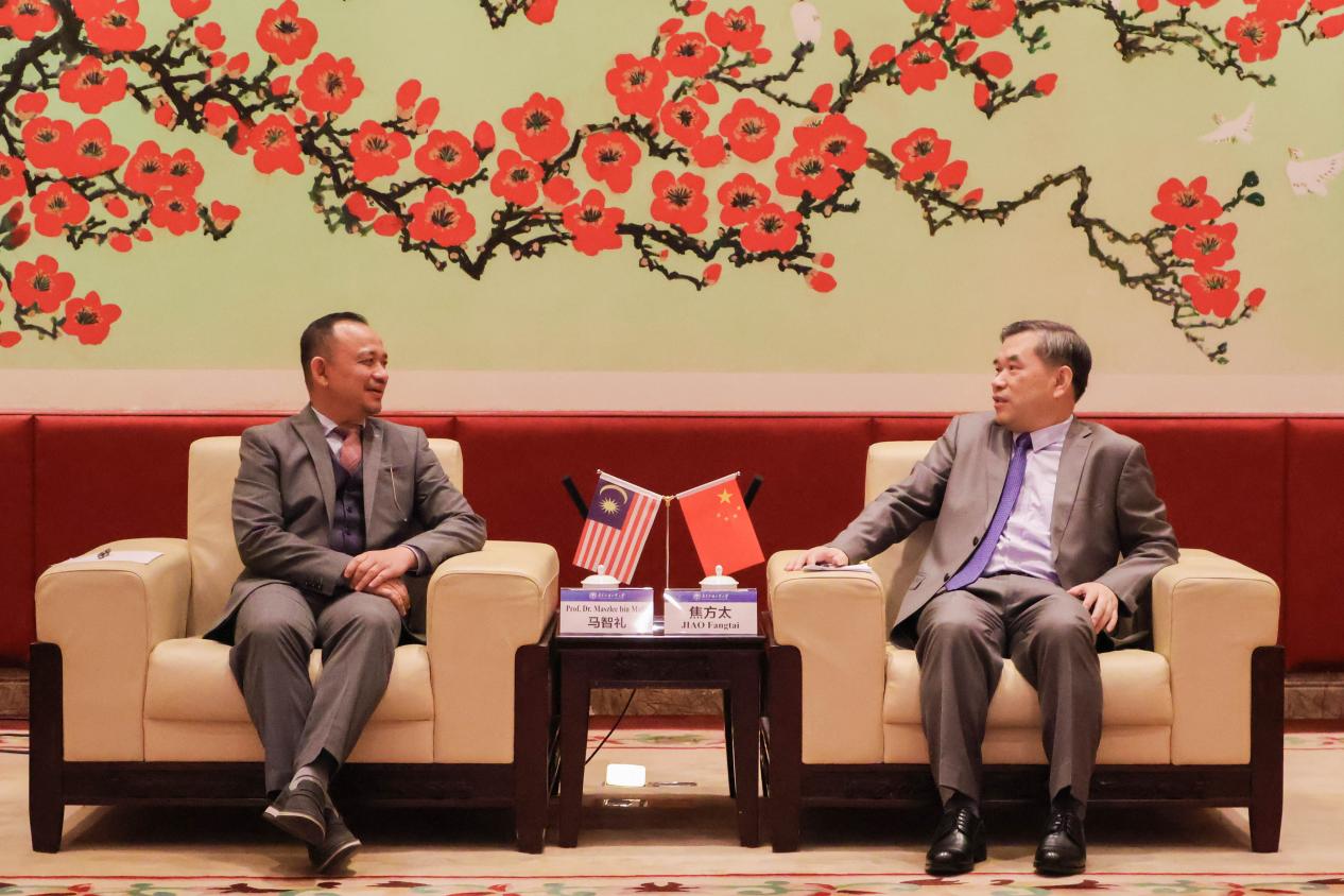 焦方太熱烈歡迎代表團的到來,并詳細地介紹了廣東外語外貿大學的建校歷程、國際交流合作成果以及馬來語專業建設的詳細情況。他指出,廣東外語外貿大學是廣東省高水平大學重點建設高校,具有鮮明的國際化特色,與馬來西亞高校以及機構在人才培養和學術交流等方面開展了多次合作。學校在外國語言文學教學與研究等領域具備顯著優勢,其中馬來語專業是教育部非通用語本科人才培養基地之一,其辦學成果在全國同類專業中名列前茅。他表示,廣外高度重視與馬來西亞高等學校的合作關系,并熱切期待未來能夠開辟更多的合作新篇章,進一步深化雙方在文化和教育領域的交流,共同培養更多具備高素質的人才,為中馬兩國之間的友誼與交流搭建更為堅實的橋梁。