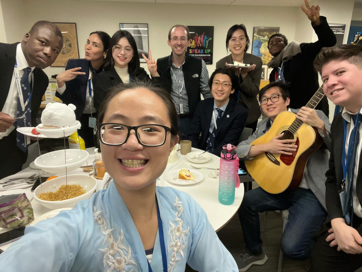“聯合國的工作氛圍真的非常好。”巧妙的是,聯合國日和曹詠儀的生日正好是同一天。去年的10月24日,既是聯合國78歲的生日,也是曹詠儀22歲的生日。當天,全球傳播部的同事們不僅為她準備了蛋糕,還精心用吉他彈奏了生日歌,傳遞不同文化之間的祝福。在實習期間,曹詠儀與身邊不同國家的同事也有著文化碰撞的新鮮體驗。來自奧地利的同事Herta和韓國的同事Soomin在學習中文,經常會向她請教各種詞匯的含義,曹詠儀在耐心回復的同時,還會將蘊含廣府文化的粵語也教授給同事們。春節期間,曹詠儀將帶有“招財進寶”合體字和“福”字的紅色燈籠送給身邊的同事,并解釋著對應的文化寓意,同事們對此非常開心,有的甚至還會多要一只紅燈籠,希望將這份文化喜慶帶回家中。“滿滿的成就感”是曹詠儀最直接的感受。曹詠儀還會在送出的新年賀卡上寫上英文的新春祝福,并向同事們解釋“恭賀新禧”“金龍呈祥”等詞的含義。