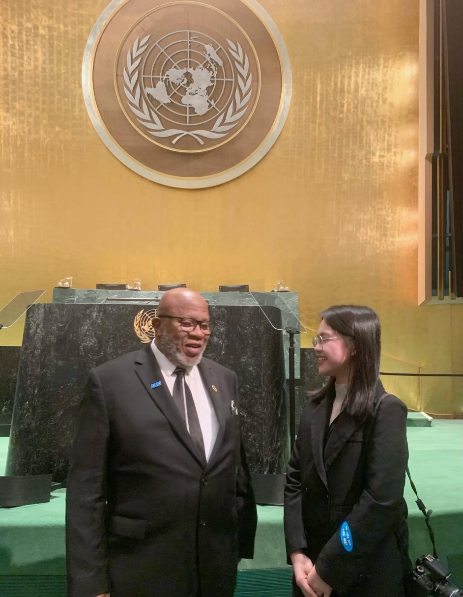 曹詠儀與第78屆聯合國大會主席弗朗西斯在大會廳交流