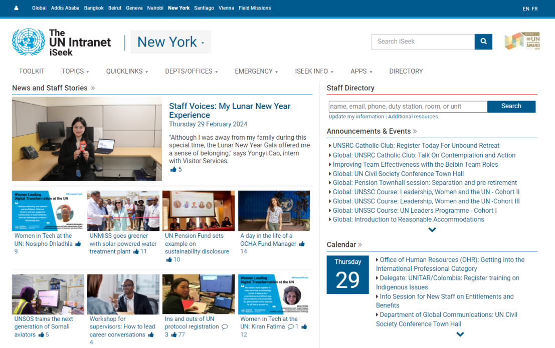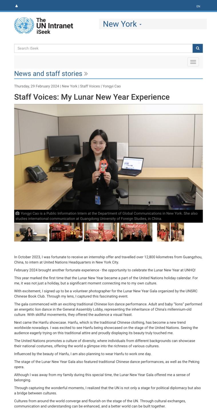 “今年是農歷新年首次被列為聯合國假日。于我而言,這不僅僅是一個假期,更是將我與自己的文化緊緊聯系在一起的紐帶。”今年二月,Staff Voices: My Lunar New Year Experience(員工心聲:我的農歷新年經歷)在聯合國網站發表,這篇文章由廣外新聞與傳播學院20級學生曹詠儀獨立撰寫,它也是聯合國網站第一篇由中國實習生講述“春節故事”的文章。