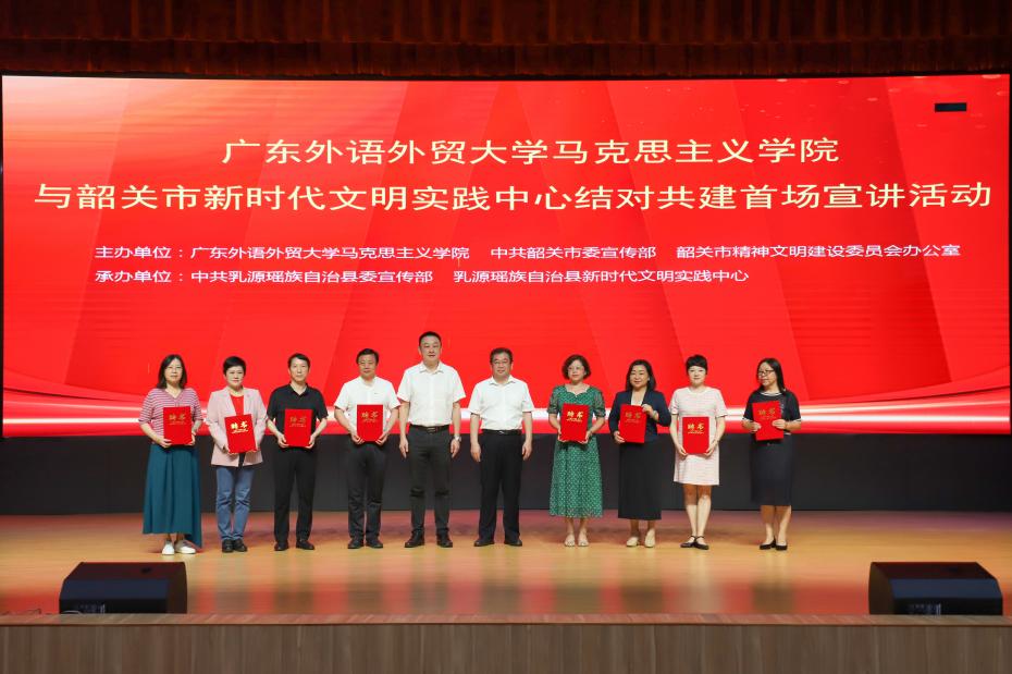 5月9日,馬克思主義學(xué)院與韶關(guān)市新時(shí)代文明實(shí)踐中心結(jié)對(duì)共建首場(chǎng)宣講活動(dòng)在乳源縣總工會(huì)舉行,韶關(guān)市委宣傳部常務(wù)副部長(zhǎng)黃勤昌出席活動(dòng)。活動(dòng)上,唐銳與黃勤昌首先為我校8名專(zhuān)家頒發(fā)聘書(shū)。隨后,馬克思主義學(xué)院院長(zhǎng)毛國(guó)民教授以《化道為器,譜寫(xiě)文化韶關(guān)新篇章》為題進(jìn)行首場(chǎng)宣講。