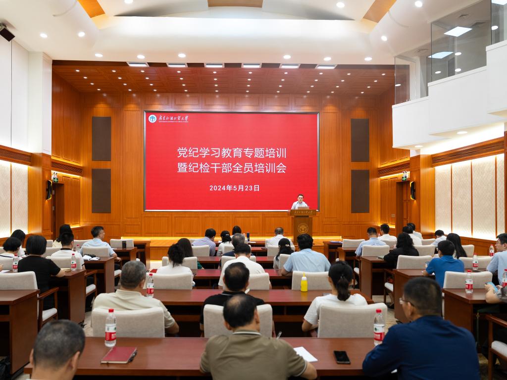 本網訊 5月23日上午,學校在白云山校區行政樓國際會議廳召開黨紀學習教育專題培訓暨紀檢干部全員培訓會。校黨委常委、紀委書記、監察專員溫燕歡出席會議并講話。校紀委副書記、紀檢監察室主任蘇奕主持會議。學校黨政機關、科研、教輔單位主要負責人,各二級黨組織書記、紀委書記、紀檢委員參加培訓。