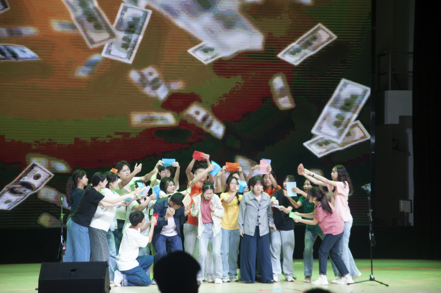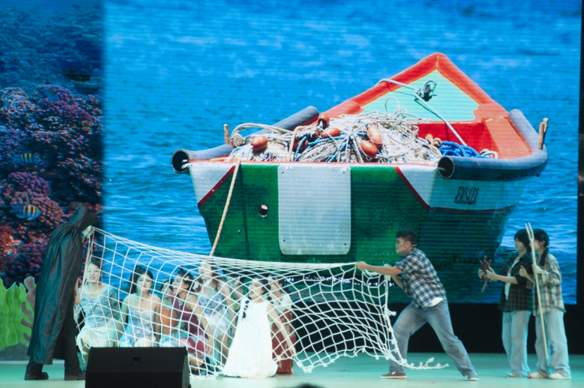 然而,就在Siana和朋友們即將把漁夫引向死亡礁石的那一刻,她看見了漁夫那無辜而純真的女兒。憐憫讓她的內心陷入了劇烈的掙扎。最終,她選擇了放下復仇的執念,聽從內心的聲音,守護海洋的和平。音樂劇《希阿娜》作為本屆戲劇大賽的新亮點,巧妙借由魚類與人類的沖突,深刻揭露了海洋生態的惡化與工業資本主義下貪婪的肆虐。通過Siana的冒險,該劇展現了個人與集體、愛恨交織以及生死抉擇的復雜情感,引發觀眾對自然生態的深刻反思。