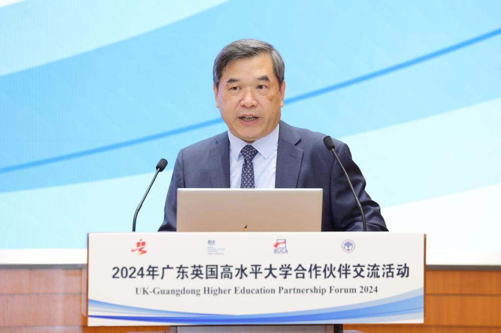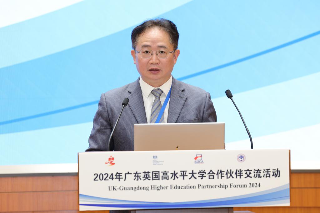 省教育廳交流合作處處長(zhǎng)李金俊代表主辦方廣東省教育廳致辭。他回顧了中英兩國(guó)在教育合作方面取得的豐碩成果,并指出在當(dāng)前復(fù)雜多變的國(guó)際形勢(shì)下,加強(qiáng)教育合作與政策溝通具有更加重要的意義。廣東省教育廳將響應(yīng)國(guó)家關(guān)于加強(qiáng)中歐人文交流的號(hào)召,推動(dòng)廣東與英國(guó)高校深入合作,共同培養(yǎng)更多具有國(guó)際視野的優(yōu)秀人才。他深入解讀了廣東省教育的基本情況和對(duì)外開(kāi)放政策,強(qiáng)調(diào)廣東省將積極響應(yīng)“一帶一路”倡議,與世界各國(guó)加強(qiáng)教育交流,打造“留學(xué)中國(guó)·學(xué)在廣東”的品牌;實(shí)施“教育對(duì)外開(kāi)放工程”,加快推進(jìn)粵港澳大灣區(qū)國(guó)際教育示范區(qū)建設(shè),深入?yún)⑴c全球教育治理,持續(xù)推進(jìn)高水平教育對(duì)外交流合作,探索教育對(duì)外開(kāi)放的廣東品牌、廣東模式。他希望以此次活動(dòng)為契機(jī),促進(jìn)中英高校實(shí)質(zhì)性合作,為兩國(guó)青年學(xué)生提供更多相互學(xué)習(xí)、共同成長(zhǎng)的機(jī)會(huì)。