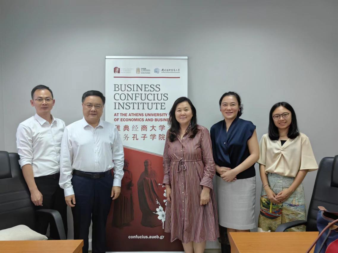為了解兄弟院校建設海外孔子學院經驗,石佑啟一行拜訪了對外經貿大學與雅典經商大學共同建設的商務孔子學院,并與中方院長嚴紅衛教授進行座談。雙方分享了在海外建設孔子學院的經驗,并就如何打造特色孔院,如何與當地院校及企業有效合作,推動國際中文教育事業發展進行深入探討。