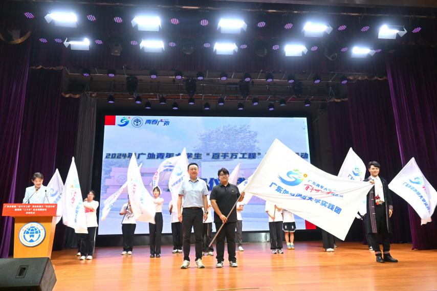 在出征儀式上,唐銳為我校“百千萬工程”突擊隊學生代表授旗。