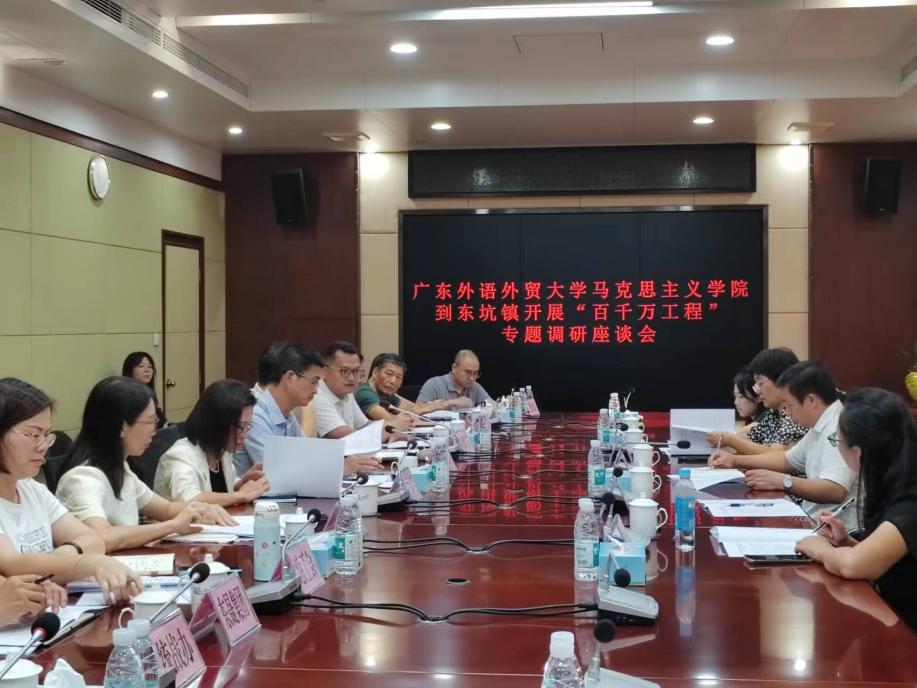 本網訊 為貫徹落實省委宣傳部、省委教育工委、省教育廳、省文明辦聯合下發的《廣東省重點馬克思主義學院2024年度基層理論宣傳工作實施方案》,做好省首批重點馬克思主義學院——廣東外語外貿大學馬克思主義學院與東莞市新時代文明實踐中心結對共建工作的調研任務,近日,我校馬克思主義學院院長毛國民教授牽頭的調研組一行赴東莞市南城街道和東坑鎮開展“推動東莞社會力量深度參與‘百千萬工程’的策略研究”課題首次調研。東莞市委宣傳部常務副部長趙國鋒,東莞市南城街道、東坑鎮等相關人員參與調研及座談會。