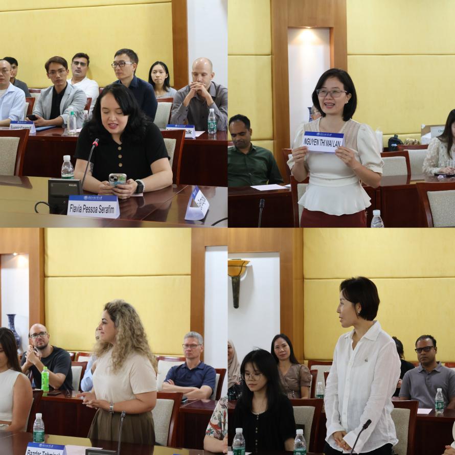 商學院副院長丁浩作為學院代表發言,他首先介紹了商學院國際事業發展現狀及學院外教工作,并對未來的合作與發展提出了展望。國際交流合作部副部長陸露也代表國際部向外教們介紹了我校國際交流項目的情況,鼓勵各位外教積極推薦所在國家或者地區的學術資源,共同推動學校的國際化建設。新加入的外教們進行自我介紹,新聞學院新聘外教金美靈作為新外教代表發言,她分享了自己初到中國所感受到的關懷與支持,表達了對未來工作和生活的期待與憧憬。