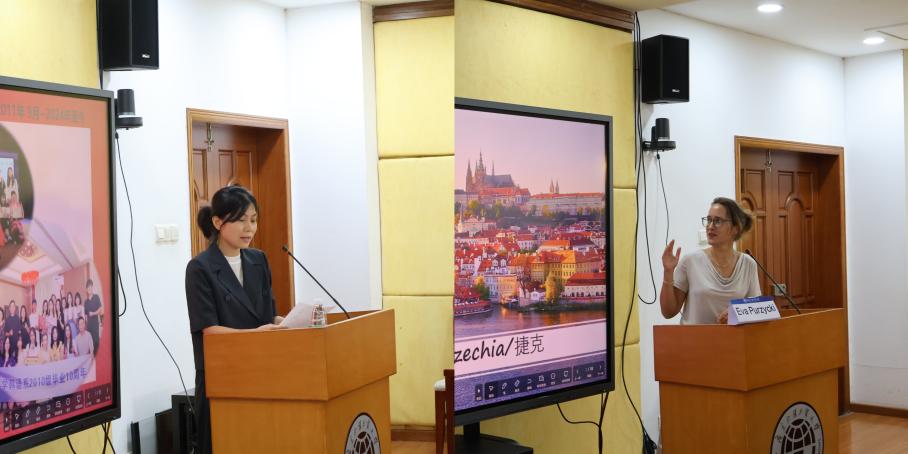 本年度共有15名外教獲聘了專業技術職稱。獲聘職稱的外教代表裴允卿教授以及優秀境外教師代表艾娃·普日茨基分別上臺發言,裴允卿從研究、教學、學生活動、社會服務活動方面分別做經驗分享。艾娃·普日茨基老師講述了她與廣外結緣的故事,并向大家介紹了她的教學情況及科研方向。