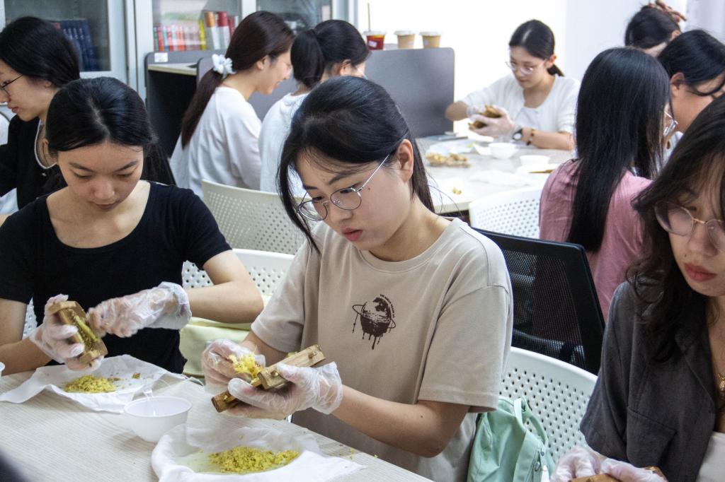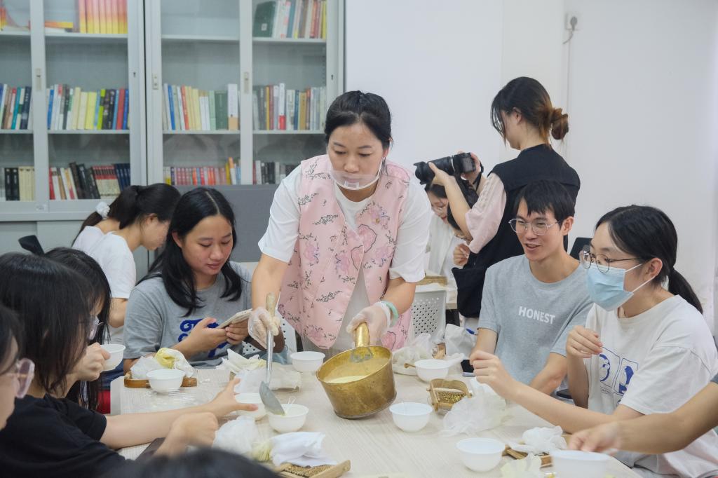 在姜埋奶體驗活動中,同學們在老師的指導下學習姜埋奶的制作,感受傳統(tǒng)甜品的獨特香醇。金融學院吳同學表示,此次非遺體驗活動是廣外人文關懷的體現(xiàn),她感嘆道“來對了”,同時希望學校多舉辦非遺傳承的活動。見同學們對傳統(tǒng)美食贊不絕口,姜埋奶制作技藝傳承人盧子壕老師表示,十分欣喜于學校對非遺傳承的重視。她期待同學們能“多吃一點傳統(tǒng)、多學一點傳統(tǒng)”,并將姜埋奶背后孝順的精神內核理解傳承下去。