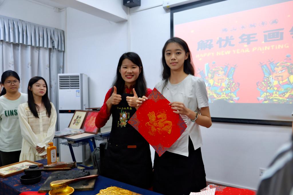 佛山木板年畫體驗活動上,劉鐘萍老師用生動幽默的講解,揭開一幅幅年畫背后的故事與寓意,吸引同學們踴躍進行互動。他們拿起已雕刻好的木板,看見一刀一劃所傳達出的匠心與細心,再將木板放在紙上,雙手穩(wěn)按,滾筒均勻滾動,揭開木板,鮮艷靈動的色塊交錯成畫。同學們將對自己的期許注入一按一揭的動作中,再對自己親手制作的年畫作品進行細致的打包與安置。劉鐘萍老師表示,未來還會開展很多活動,“如果同學們合適、感興趣或順路,我們可以一起探討?!?/p>