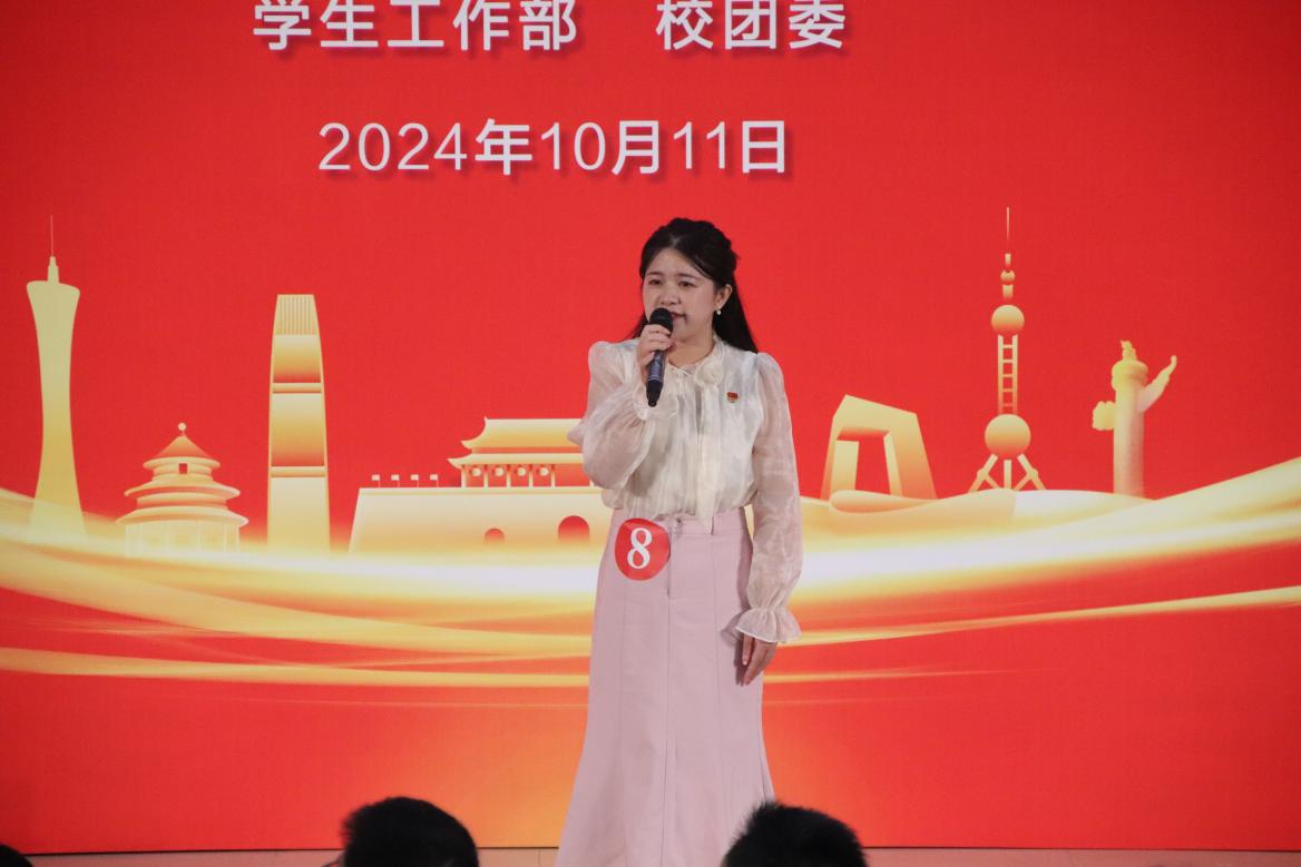 學生組決賽中,來自商學院的李慕涵、中文學院的譚秀薇、法學院的武子怡作為選手代表,帶來了激情滿懷的詩歌朗誦——《榮耀75載,共筑盛世中華》,共同為偉大祖國獻上誠摯祝福。