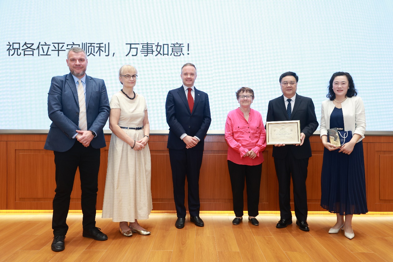 諾沃特尼亞克總領事首先宣讀了波蘭共和國駐華大使古天衛(Jakub Kumoch)衛活動發來的賀信,賀信中高度肯定了廣外波蘭語專業在過往十年的中波文化交流上所做出的突出貢獻。諾沃特尼亞克總領事指出,波蘭語專業搭建了中波人才交流、學術交流、文化交流的橋梁。為表彰廣外波蘭語教學團隊做出的杰出貢獻,總領事特意向波蘭語系頒發了“優秀表彰獎”。在開幕式環節上,華沙大學副校長馬切依·萊施教授(Maciej Ra?)表達了對廣外波蘭語系的高度肯定,并向廣東外語外貿大學頒發了友好合作獎章。密茨凱維奇大學校長博古米娃·卡涅芙斯卡教授(Bogumi?a Kaniewska)則在賀信中對茅銀輝教授在兩校在人才培養合作中的卓越貢獻大加贊賞,并向其頒發了“杰出貢獻獎”。