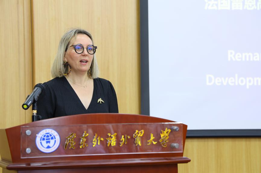 許月麗對雷恩創新班在專業課程、語言培訓、留學服務與實習就業體系的亮點和特色進行總結。她指出,這些亮點和特色是雷恩創新班始終堅持創新、追求卓越所取得豐厚成果的強大證明,更是未來兩校繼續強化合作的強大動力。教師代表李鐵立表示,在中國與歐盟,尤其與法國的經濟、文化交流密切的時代背景下,雷恩創新班成立十年來為中法經濟貿易合作培養了大量人才。他指出,在雙方真誠合作取得顯著成果下,中法雷恩班已經成為廣外創新人才培養模式的重要平臺。獲獎代表何元貴和楊蓓從雷恩創新班合作歷程和發展軌跡等方面分享了自身的工作經歷,并對合作辦學期間兩校各部門的有力支持和配合表示感謝。