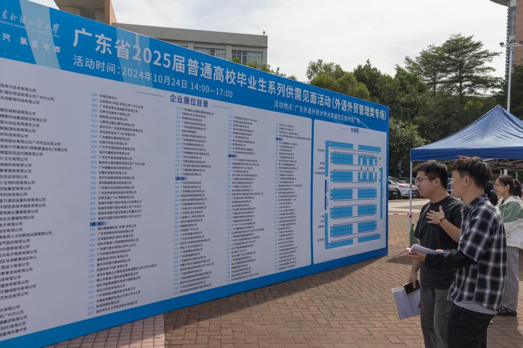 本網(wǎng)訊 10月24日下午,由廣東省教育廳主辦、我校承辦的“粵就業(yè)”廣東省2025屆普通高校畢業(yè)生系列供需對接活動(外語外貿(mào)管理類專場)在我校大學城校區(qū)圖書館廣場順利舉辦。本次供需見面活動依托廣東學生就業(yè)創(chuàng)業(yè)智慧服務平臺,采取線上線下一體化的方式進行,吸引了廈門建發(fā)、中信證券、蘇寧易購、新東方、藍月亮、海連(中國)國際貨運、廣之旅、燕塘乳業(yè)、伊利、長城汽車等269家優(yōu)質(zhì)用人單位參會,涵蓋行業(yè)廣泛,如互聯(lián)網(wǎng)、生物醫(yī)藥、能源化工、文化教育、金融證券、商貿(mào)服務等。