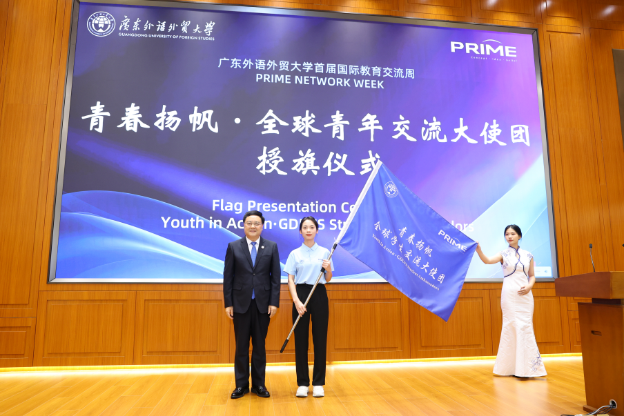 在PRIME計劃框架下,為進一步豐富學生國際體驗,培養具有國際視野,具有跨文化交際能力的廣外青年,展現我校國際化形象,學校成立“青春揚帆·全球學生交流大使團”。開幕式上,石佑啟為大使團授旗。