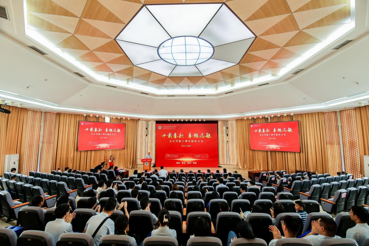 本網訊 11月2日,會計學院“十載春秋,卓越遠航”十周年院慶暨校友會理事會換屆大會在大學城校區舉行。校黨委常委、副校長何傳添、學生工作部部長國佳、校辦副主任楊博、發展規劃部副部長劉祥和、商學院黨委副書記沈長霞以及地方校友會代表、學院退休教師代表、學院歷屆校友共計200余人歡聚一堂,共同見證學院第三屆校友會的換屆,一同慶賀會計學院成立十周年。會議由學院黨委書記黎冬主持。