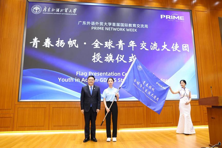 本網訊 為進一步豐富在校學生的國際體驗,為學校搭建重要外事活動的優秀人力資源庫,推動青年參與國際交流,校團委、國際交流合作部牽頭成立了青春揚帆·全球學生交流大使團。11月5日,廣外首屆國際教育交流周在白云山校區行政樓國際會議廳啟幕,這也標志著“青春揚帆·全球學生交流大使團”成立。在交流周的開幕式上,校黨委書記石佑啟將象征著榮譽與使命的旗幟授予大使團代表。