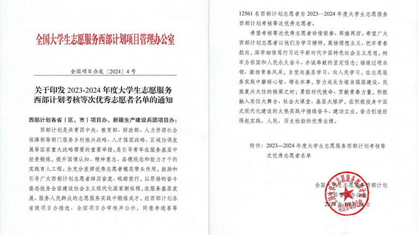本網(wǎng)訊 近日,西部計劃全國項目辦印發(fā)了《關(guān)于印發(fā)2023-2024年度大學(xué)生志愿服務(wù)西部計劃考核等次優(yōu)秀志愿者名單的通知》,經(jīng)西部計劃各省級項目辦推選、全國項目辦審核并公示,我校共有8名志愿者獲評全國西部計劃考核優(yōu)秀等次志愿者,分別是:經(jīng)濟(jì)貿(mào)易學(xué)院李枚憶、商學(xué)院成夢嫣、西方語言文化學(xué)院祝婉婷、亞非語言文化學(xué)院朱毅暉、法學(xué)院葉潔雙、國際關(guān)系學(xué)院黃奕涵、社會與公共管理學(xué)院孫麗媛以及信息科學(xué)與技術(shù)學(xué)院高海麗。