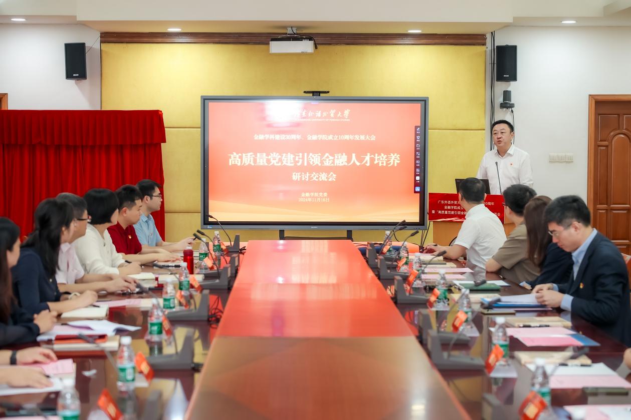 本網訊 11月16日上午,廣外金融學科建設30周年、廣外金融學院成立10周年發展大會暨“高質量黨建引領金融人才培養”研討交流會在我校大學城校區校辦公樓第一會議室舉辦。本次會議由我校金融學院主辦,北京科技大學創新創業學院、中山大學國際金融學院、華南理工大學經濟與金融學院、暨南大學經濟學院、華南師范大學經濟與管理學院、華南農業大學經濟管理學院、廣東財經大學金融學院、廣東金融學院金融與投資學院等高校院系黨委書記、組織員,我校黨委副書記唐銳、學生工作部部長國佳、黨委組織部副部長楊雄輝、金融學院黨委相關人員等三十余人參會。會議由我校金融學院黨委書記徐昶斌主持。