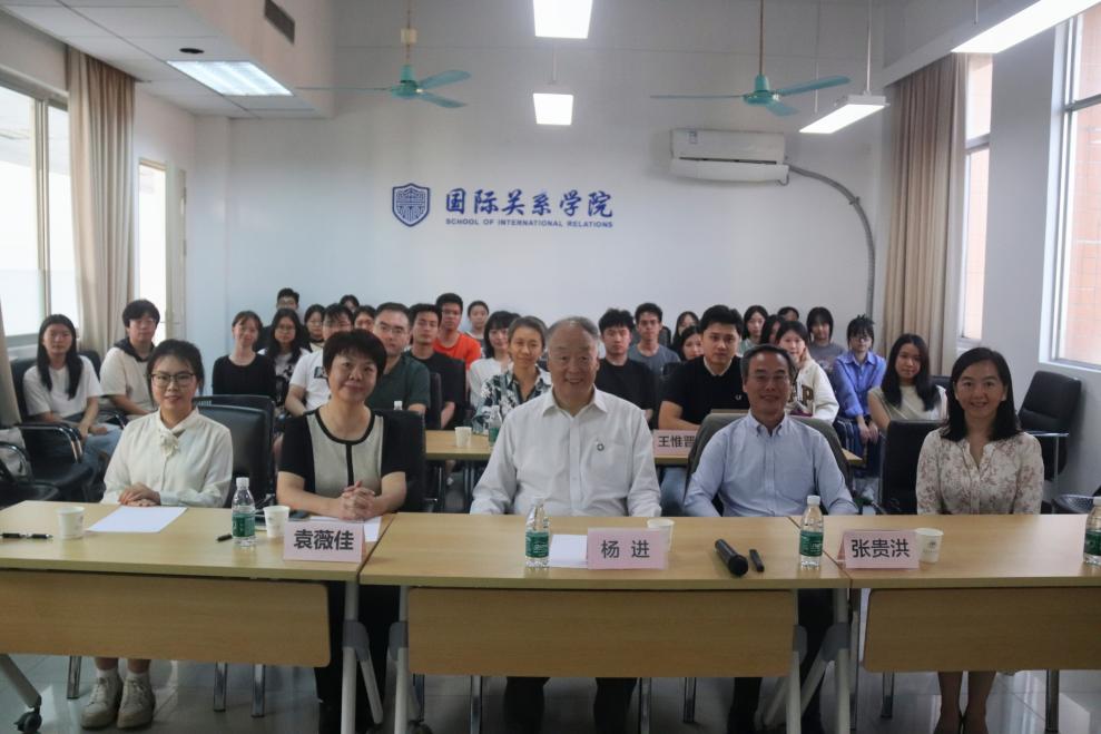 本網訊 11月18日下午,由國際關系學院主辦的國關大講堂第56講暨我與外交官面對面第五講在大學城校區開講。中國常駐聯合國教科文組織原大使銜代表、中國駐法國大使館教育處原公使銜參贊、聯合國教科文組織終身學習研究所理事會成員楊進大使以“全球治理中的國際組織與當代青年的國際勝任力”為題作專題講座。講座由我校客座教授、復旦大學聯合國與國際組織研究中心主任張貴洪教授主持,國際關系學院領導與師生參加本次活動。
