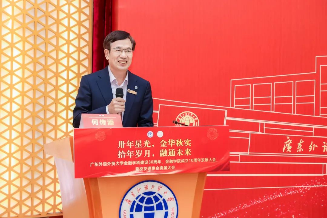 何傳添在致辭中回顧了金融學院在學科建設和服務社會方面取得的成績,并寄語校友們以校友情誼為紐帶,愛校榮校,為母校發展貢獻力量;以校友資源為平臺,興校強校,助力學校事業發展;以校友發展為共同體,互幫互助,共同創造美好未來。他強調了校友在學院發展中的重要作用,并對未來的合作與發展提出了期望。