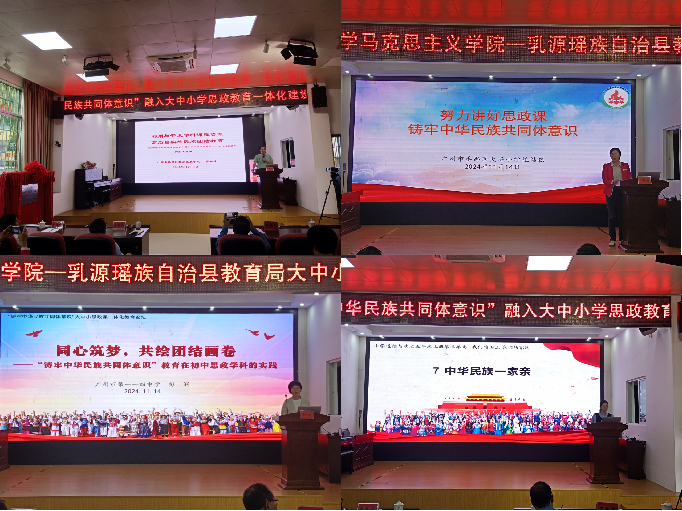 本網訊 為貫徹落實廣東省委、省教育工委“雙百行動”工作,推動鑄牢中華民族共同體意識融入大中小學思政教育一體化建設,11月14日,馬克思主義學院——乳源教育局大中小學思政課一體化共同體建設工作室授牌儀式暨“鑄牢中華民族共同體意識”融入大中小學思政教育一體化建設論壇在乳源瑤族自治縣教育局舉行。中央“馬工程”首席專家、馬克思主義學院名譽院長、博士生導師謝迪斌,馬克思主義學院黨委書記麥培年,我校駐乳源“雙百行動”服務隊長、副處長畢建永以及廣州市相關思政名師,乳源縣教育工委書記、縣教育局局長付慧燕等相關領導、縣教師代表共計120多人參加活動。本次活動由乳源縣教育局黨組成員羅屆中主持。