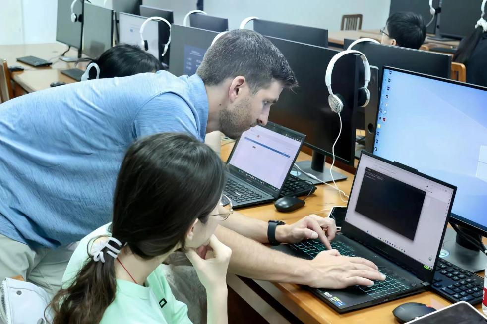 來自美國密蘇里大學新聞學院的Dr. Ernest Zhang和Caleb Heinzman老師,受邀為廣外新聞與傳播學院本科生講授“人工智能在新聞傳播領域的應用及如何避免ChatGPT的錯誤”課程。他們授課經驗豐富,由易入難、悉心指導,帶領同學們系統學習了人工智能與新聞傳播結合領域的先進觀念與國際前沿知識,內容涵蓋自然語言處理、計算機視覺和機器學習,以及如何理解和運用電腦編程創造性地解決新聞報道中的問題。來自新聞與傳播學院的喻同學激動道:“又長又復雜的代碼,五天前我絕對不會相信這是自己能寫出來的!”她表示,自己之前對編程的了解甚少,只將這一研學項目視作外語和專業知識的雙重挑戰,但沒想到自己“真的做到了”。