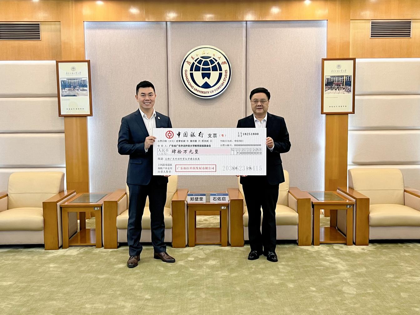 鄭壁奎校友向基金會捐贈四十萬元人民幣,助力母校建設發展。石佑啟代表基金會接受捐贈支票,并向鄭壁奎校友回贈捐贈證書。